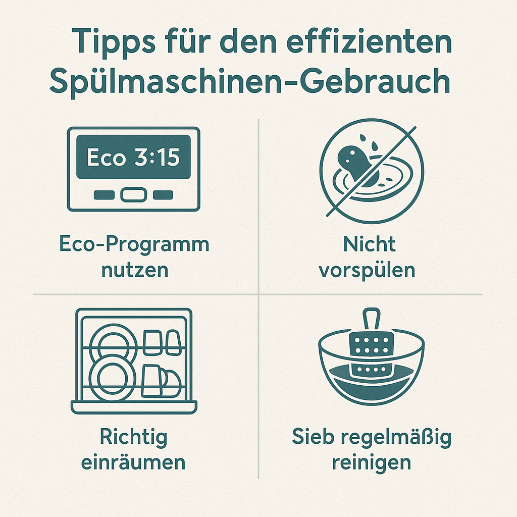 Für alle, die jetzt Lust bekommen haben, ihre eigene Spülmaschine zu optimieren, hier nochmal unsere wichtigsten Erkenntnisse: Eco-Programm nutzen, auch wenn es länger dauert. Nicht vorspülen, nur grobe Reste entfernen. Maschine voll beladen, aber nicht überladen. Geschirr richtig einräumen – Teller nach unten, Gläser nach oben, Besteck gemischt. Temperatur zwischen 50 und 55 Grad für den Alltag. Einmal im Monat heiß durchlaufen lassen für die Hygiene. Sieb regelmäßig reinigen. Salz und Klarspüler nachfüllen. Tür nach dem Spülgang einen Spalt öffnen zum Trocknen.