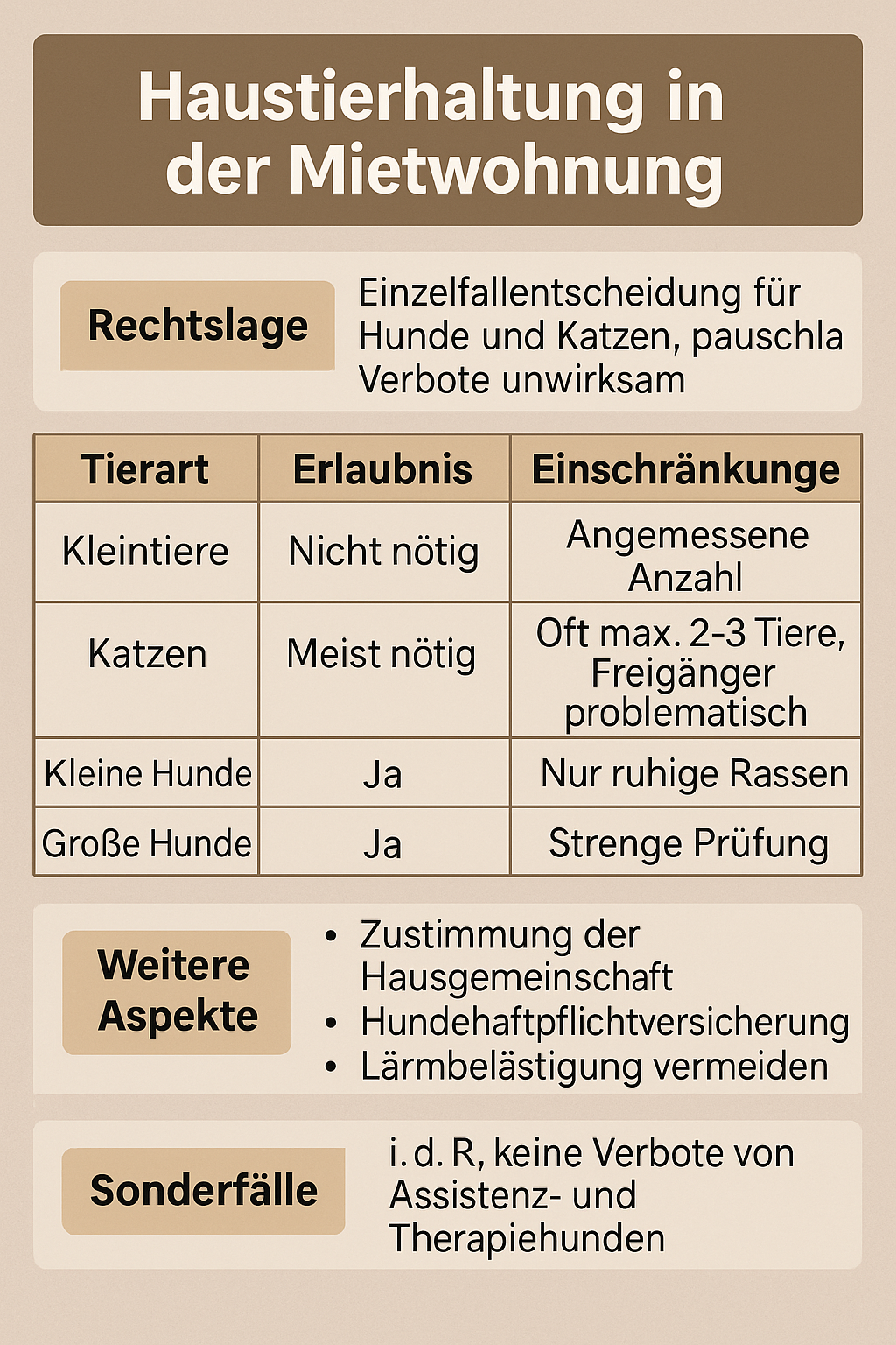 Während unserer Recherche stießen wir auf interessante Sonderfälle. Assistenzhunde zum Beispiel – Blindenführhunde, Diabetikerwarnhunde oder Hunde für Menschen mit PTBS – dürfen praktisch nie verboten werden. Das gilt als Diskriminierung. Ein Freund von uns, der im Rollstuhl sitzt, hat einen Assistenzhund, der ihm Gegenstände aufhebt und Türen öffnet. Sein Vermieter hatte anfangs Bedenken, konnte aber rechtlich nichts machen. Auch Besuchshunde sind ein Thema: Wenn die Schwiegermutter mit ihrem Pudel zu Besuch kommt, kann der Vermieter das nicht verbieten, solange es sich um normale Besuche handelt und der Hund nicht dauerhaft in der Wohnung lebt.