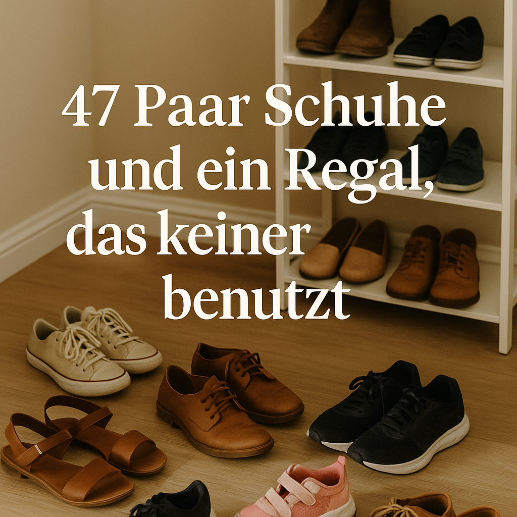 Manchmal denke ich, unser Schuhchaos ist eine Metapher für unser Leben. Wir wissen, was richtig wäre. Wir haben die Mittel dazu. Aber zwischen Wissen und Tun liegt dieser riesige Berg namens Alltag. Und der Alltag gewinnt meistens.