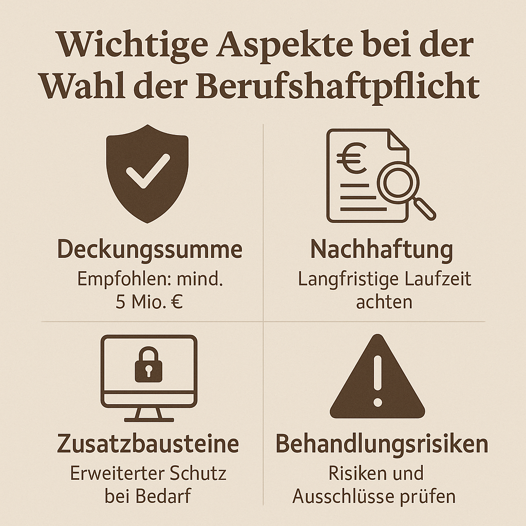 Nach all unseren Recherchen und Erfahrungen haben wir beide unsere Berufshaftpflichtversicherungen komplett überarbeitet. Die Prämien haben sich dadurch etwa verdoppelt – von 600 auf 1200 Euro bei mir, von 500 auf 1100 Euro bei meinem Mann. Das klingt viel, aber dafür haben wir jetzt: Deckungssummen von 10 Millionen Euro, keine Selbstbeteiligung, unbegrenzte Nachhaftung, Einschluss von Telemedizin und Datenschutzverletzungen, Verzicht auf Einrede bei grober Fahrlässigkeit, weltweite Deckung außer USA/Kanada, und Mitversicherung aller Mitarbeiter und Vertretungen. Der Seelenfrieden, den das bringt, ist unbezahlbar.