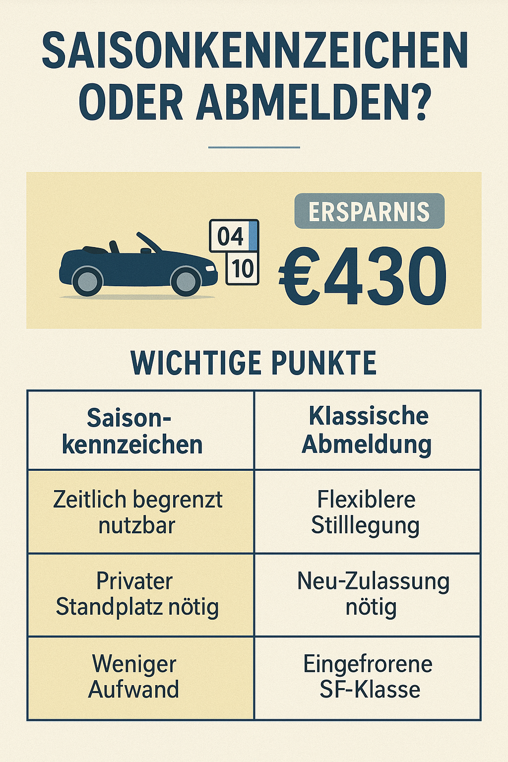 Nach all den Jahren mit Saisonkennzeichen können wir sagen: Für uns war es die richtige Entscheidung. Die Ersparnis ist deutlich, der Aufwand minimal, und die festen Zeiträume geben unserem Cabrio-Jahr eine schöne Struktur. Das erste Ausfahren im April ist jedes Mal wie ein kleines Fest, das Einmotten im Oktober hat etwas Wehmütiges. Natürlich gibt es Situationen, wo wir uns mehr Flexibilität wünschen würden, aber die sind selten. Die Alternative wäre, das Cabrio ganzjährig zuzulassen und dann doch die meiste Zeit stehen zu lassen - das wäre reine Geldverschwendung.
