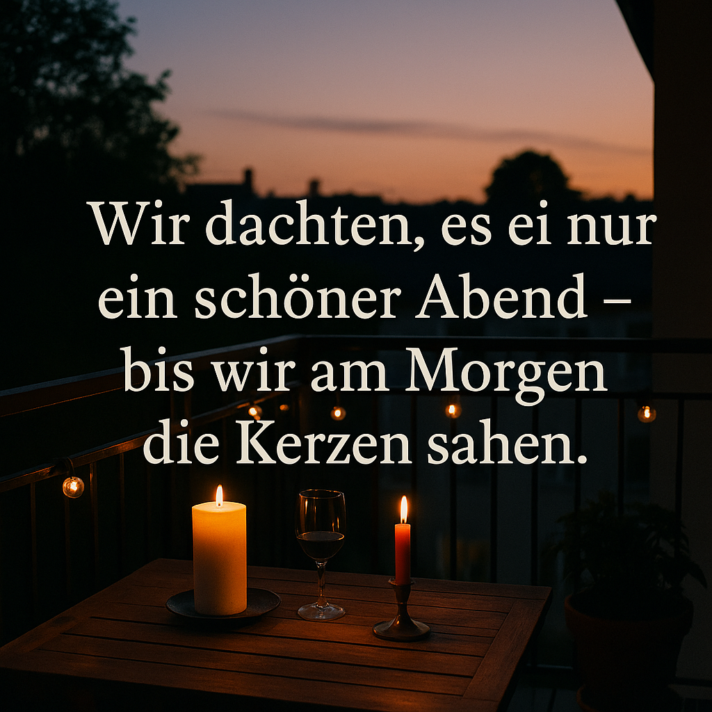Am nächsten Morgen bin ich als Erste rausgegangen. Die Sonne schien schon, es war wieder so ein Tag, an dem man denkt: Sommer, ich liebe dich. Ich wollte kurz lüften, vielleicht schon mal den Kaffee anmachen, und als ich die Balkontür aufschob, hab ich sie gesehen. Die Kerzen. Oder besser: die Reste davon.