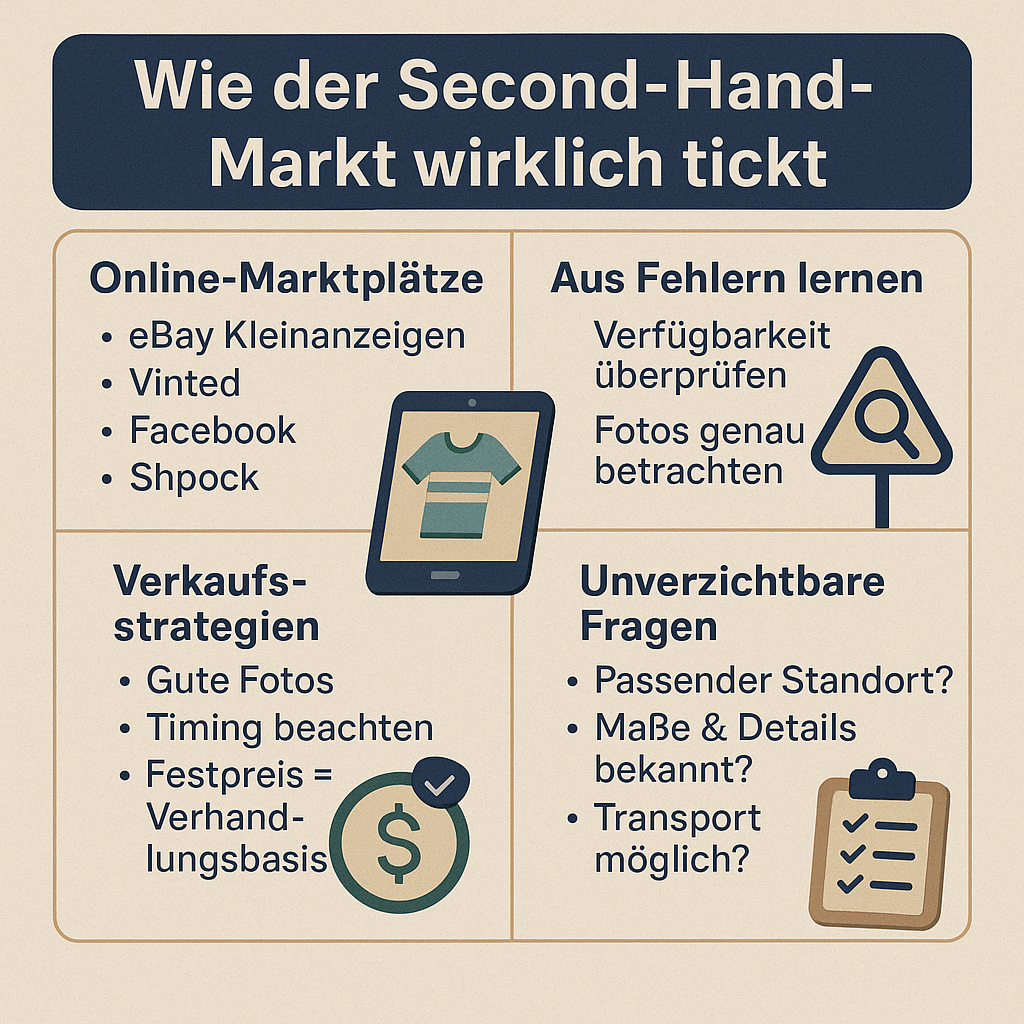 Nach all den Erfahrungen haben wir unsere Strategien verfeinert. Wir haben eine Checkliste für Käufe: Maße prüfen, Standort checken, Transportmöglichkeit klären, Preis verhandeln, Zustand genau anschauen. Beim Verkaufen: Gute Fotos bei Tageslicht, ehrliche Beschreibung, fairer Preis, schnelle Kommunikation, flexibel bei Abholung.